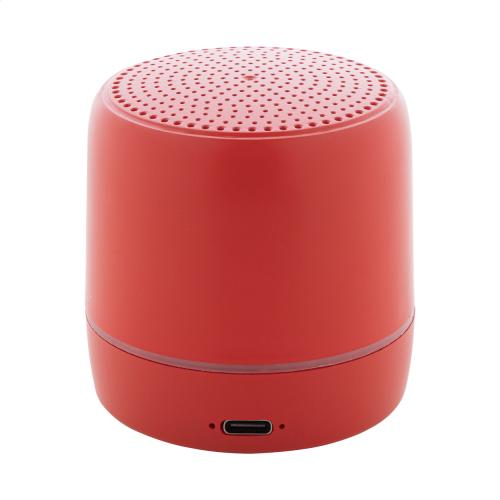 Recycled ABS wireless speaker with hands-free call function and built-in rechargeable battery. Including USB charger cable.