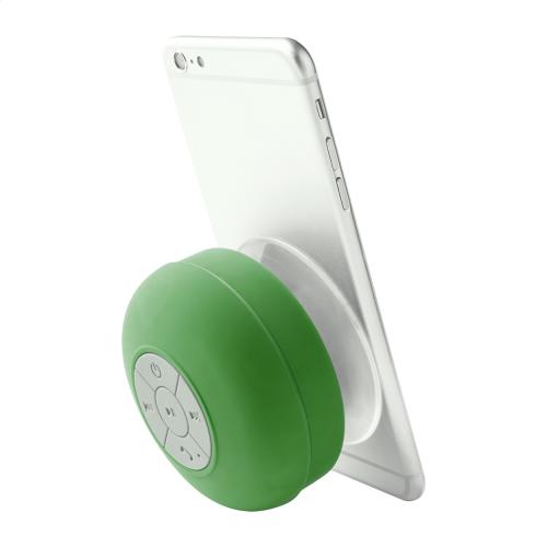 Wireless speaker with rubber-coated housing and large suction cup. With hands-free call function and built-in rechargeable battery. Including USB charger cable.