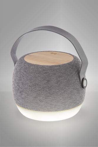 Wireless speaker in RPET fabric covered recycled ABS housing with LED light at the bottom and bamboo plate wireless fast charger (15W) on the top. With PU leather carry strap, hands-free call function and built-in rechargeable battery (1200 mAh). Including USB charger cable.