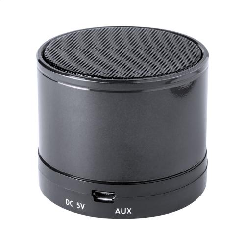 Wireless speaker in recycled aluminium and recycled ABS housing. With radio, MP3 player, hands-free call function and built-in rechargeable battery (300 mAh). Including USB charger and aux-in cable.