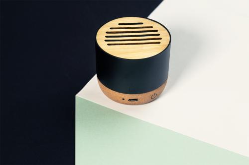 Wireless speaker in recycled aluminium housing with bamboo mesh and natural cork base. With rechargeable battery (400 mAh). Including USB charger cable.