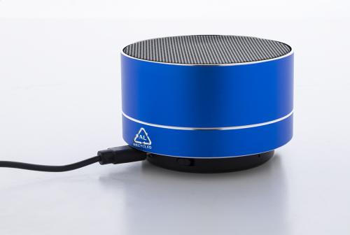 Recycled aluminium wireless speaker with metal mesh, LED light on the bottom and rechargeable battery (300 mAh). With hands-free call and micro SD MP3 playback functions. Including USB charger cable.