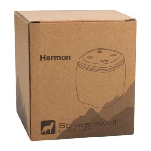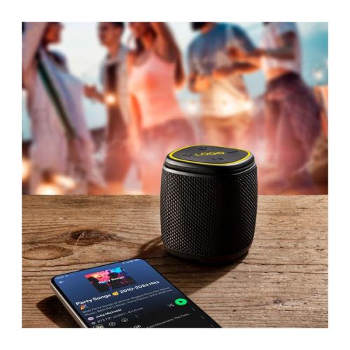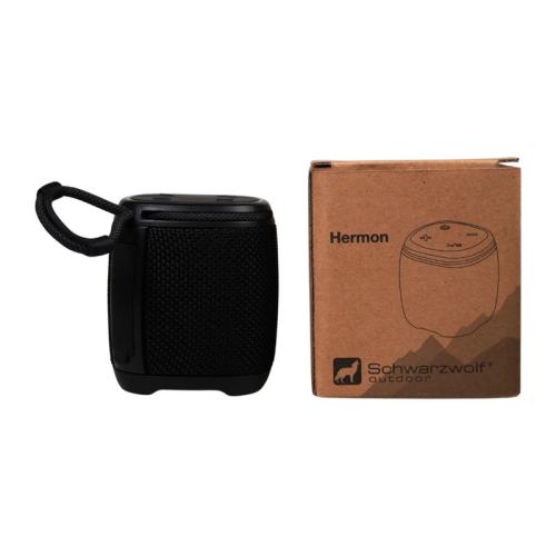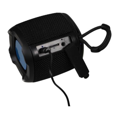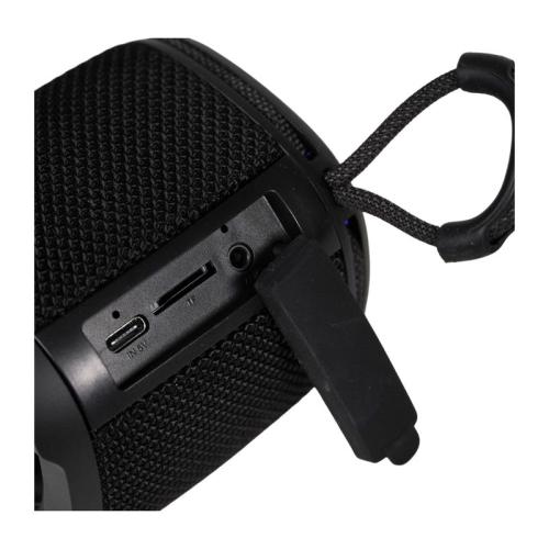 Schwarzwolf outdoor wireless slightly water resistant speaker is made in a black color with a wrist strap. It has an output of 5W, a range of 20 m, Bluetooth V5.1., a slot for a TF card and an USB-C connector. It contains an integrated rechargeable battery with a capacity of 500 mAh. Playing time on one charge is approx. 3–4 hours. Charging time to full charge is approx. 1–2 hours. The laser-engraved logo and border of the control panel is illuminated by changing colors of LED light. The speaker has a IPX5 water protection. The charging cable is included in the package. Packed in a gift box.