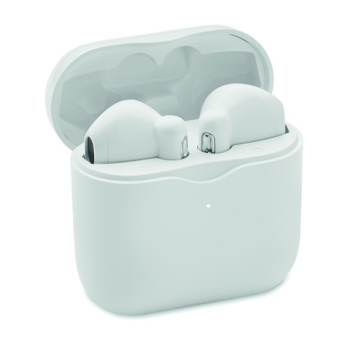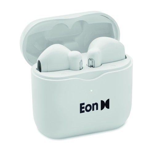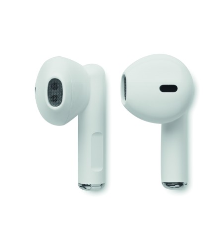 ABS True Wireless Stereo (TWS) 5.3 wireless stereo earphones with microphone and 30 mAh build-ion battery and 200 mAh charging box. Playing time approx. 4 hours. Auto-pairing.