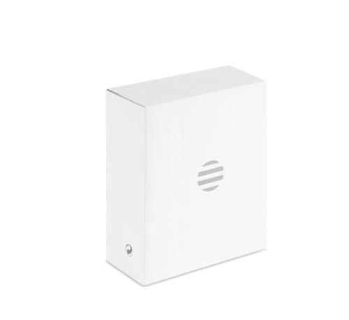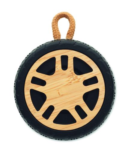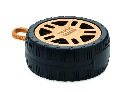 Car Tire shaped 5.3 wireless 3W speaker in recycled ABS with bamboo detail and cotton rope handle. 400 mAh rechargeable battery.