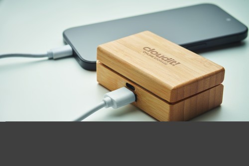 TWS earbuds with microphone in bamboo case. Includes 1200 mAh emergency power bank with type-C input and type-A output. Auto-pairing.
