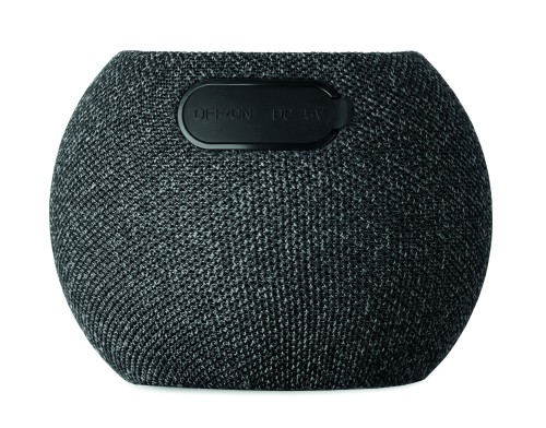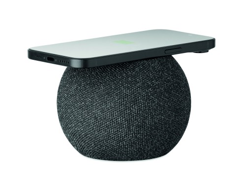 5.0 wireless speaker and 15W wireless charging in ABS and RPET fabric and black coated bamboo detail on top. 1 Rechargeable Li-ION 1200 mAh battery included. Includes an SD card port and an AUX/ USB cable. Output data: 5W, 3 Ohm and 5V. Playing time approx. 5h.