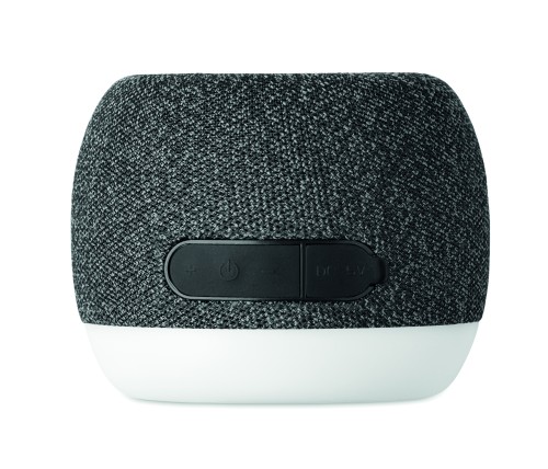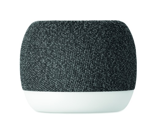 5.0 wireless speaker and 15W wireless charging in ABS and RPET fabric and black coated bamboo detail on top with mood light base. 1 Rechargeable Li-ION 1200 mAh battery included. Includes an SD card port and an AUX/ USB cable. Output data: 5W, 3 Ohm and 5V. Playing time