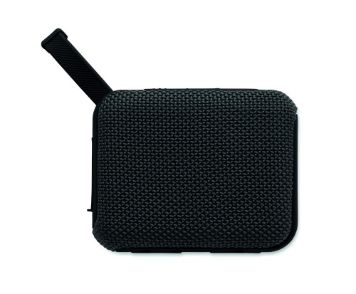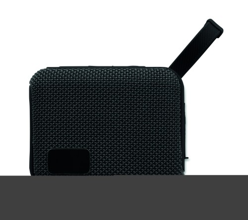 5.0 wireless speaker in ABS with RPET fabric and hanging cord. 1 Rechargeable Li-ION 800 mAh battery included. Includes an SD card port and an AUX/ USB cable. Output data: 5W, 3 Ohm and 5V. Playing time approx. 3h