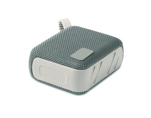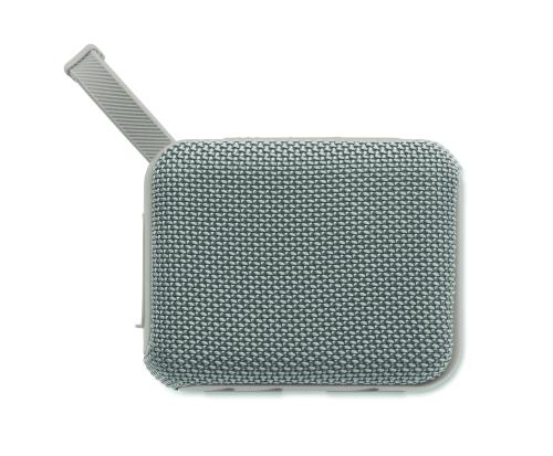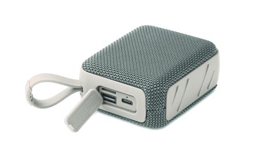 5.0 wireless speaker in ABS with RPET fabric and hanging cord. 1 Rechargeable Li-ION 800 mAh battery included. Includes an SD card port and an AUX/ USB cable. Output data: 5W, 3 Ohm and 5V. Playing time approx. 3h