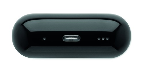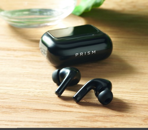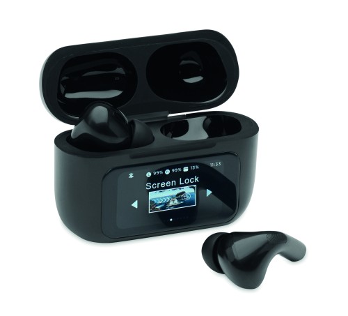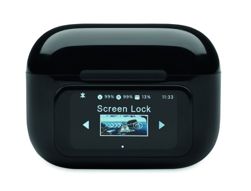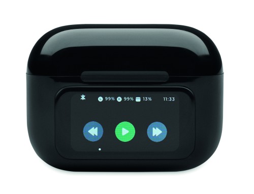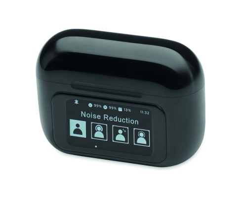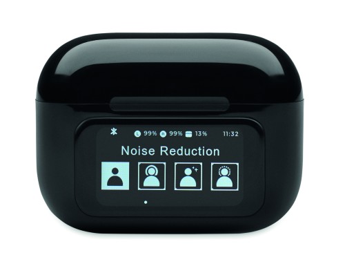 ABS True Wireless Stereo (TWS) 5.0 wireless stereo earbuds (30 mAh) with ANC/ENC and microphone and 230 mAh charging base. Touch screen control and display.