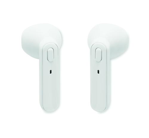 Set of 2 True Wireless Stereo (TWS) 5.3 earbuds with microphone 30 mAh battery built-in. Playing time approx. 3 hours. Auto-pairing. Including a micro USB charging cable and a 185 mAh charging station. Made from recycled ABS.