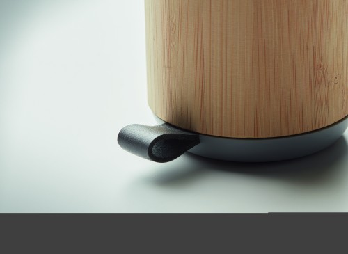 5.3 wireless speaker in bamboo cover and ABS on top with PU strap. 1 Rechargeable Li-Ion 300 mAh battery. Output data: 3W, 4 Ohm. Playing time approx. 2h. Bamboo is a natural product, there may be slight variations in colour and size per item, which can affect the final decoration outcome.