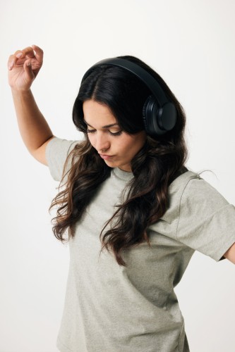 Foldable wireless headphone and strong bass. Made with RCS (Recycled Claim Standard) certified recycled aluminium and ABS. Total recycled content: 70% based on total item weight. RCS certification ensures a completely certified supply chain of the recycled materials. Aluminium does not lose its characteristics in the recycling process and can be recycled endlessly. Including recycled type C charging cable made from RCS certified recycled aluminum, TPE and PET. The 600 mah battery allows a playtime up to 15 hours and can be fully re-charged in 2 hours. With BT 5.3 for smooth connection up to 10 metres. Packed in FSC® mix packaging. Item and accessories 100% PVC free. With MIC to answer calls.
