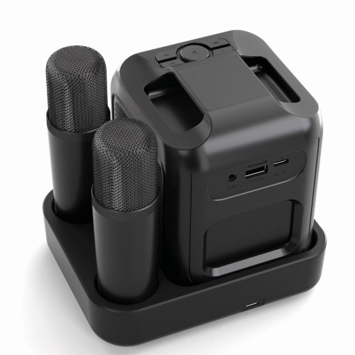 Sing, dance and have fun with your friends with this quality karaoke set with two microphones that allows you to sing in stereo with your best friends. The speaker and mic come with an induction charging base so you can charge all three easily at the same time. Simply switch on a music video with lyrics or enable the lyrics in your favorite music player and get ready for hours of fun! The 5W speaker comes with a 2000 mah battery that allows up to 6 hours of usage. The speaker also supports TF card and USB for music. When using the microphones you can move up to 10 meters away from the speaker. The speaker is made with RCS (Recycled Claim Standard) certified recycled ABS. Total recycled content: 53% based on total item weight. RCS certification ensures a completely certified supply chain of the recycled materials. Including type C charging cable made from RCS certified recycled TPE. Packed in FSC® mix. PVC Free.