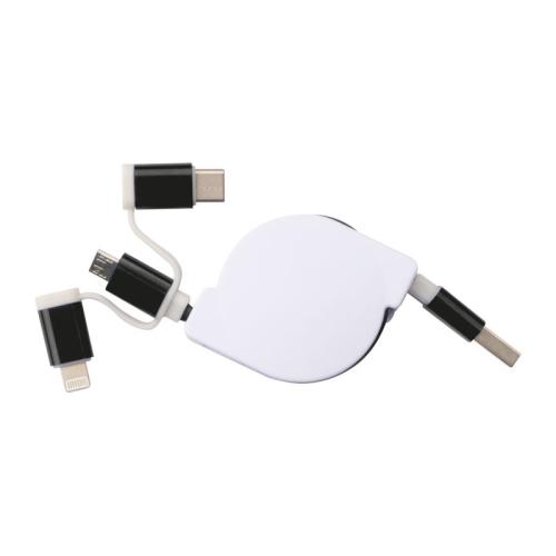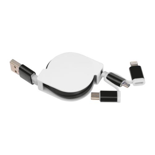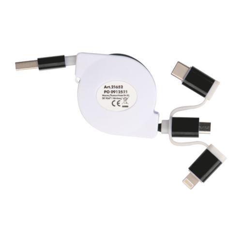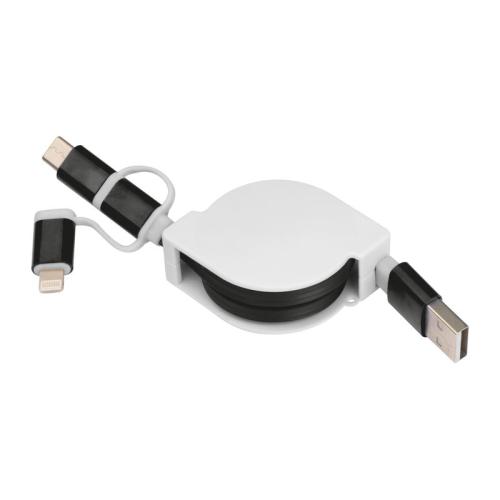 Extendable charging cable in a plastic housing with a USB plug and an iOS, C-Type and Micro USB connection.