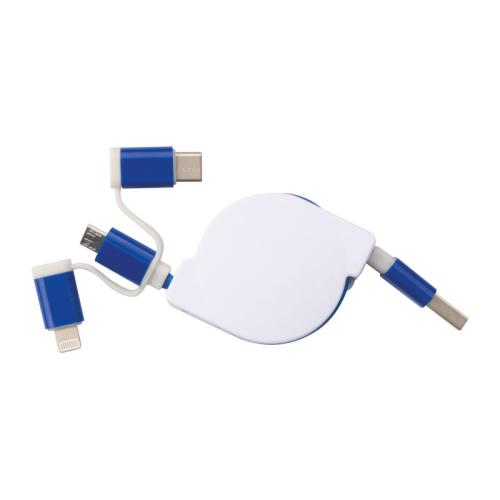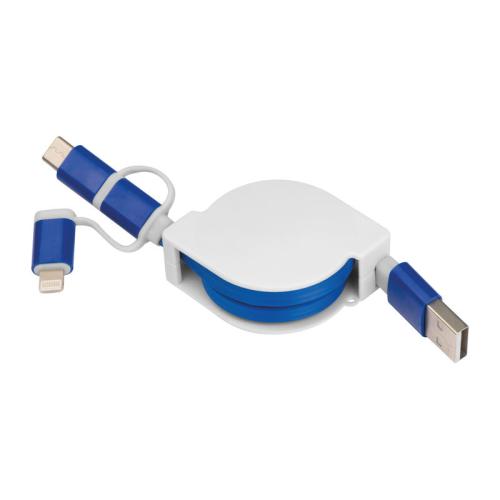 Extendable charging cable in a plastic housing with a USB plug and an iOS, C-Type and Micro USB connection.