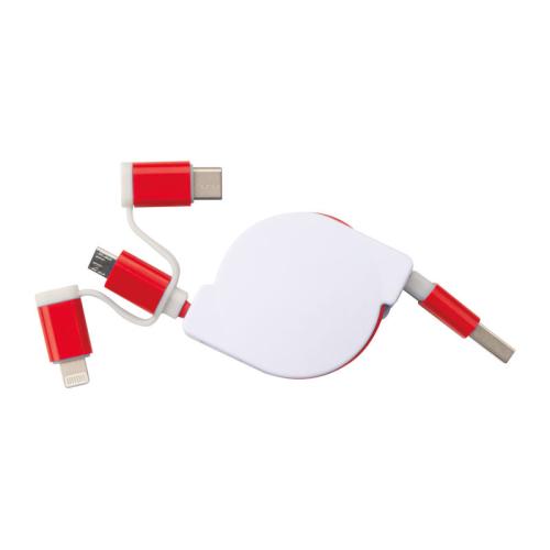 Extendable charging cable in a plastic housing with a USB plug and an iOS, C-Type and Micro USB connection.