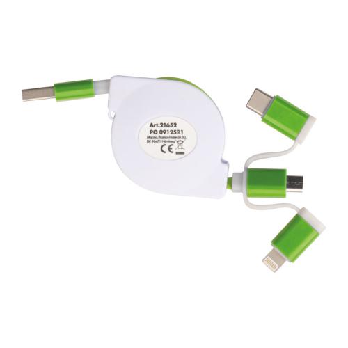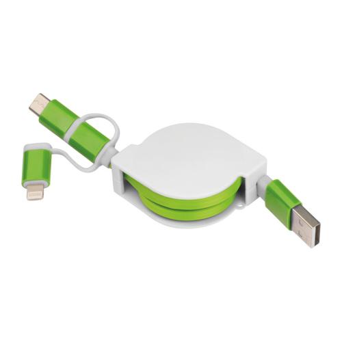 Extendable charging cable in a plastic housing with a USB plug and an iOS, C-Type and Micro USB connection.