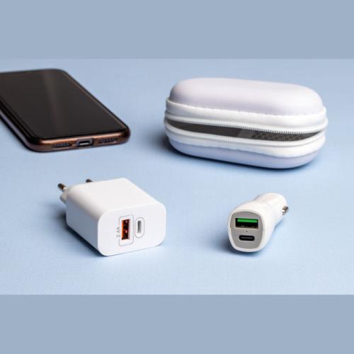 Travel set consisting of a USB and a C-type connection, optionally on the mains plug or the 12-volt plug. Packed in a zipper case.