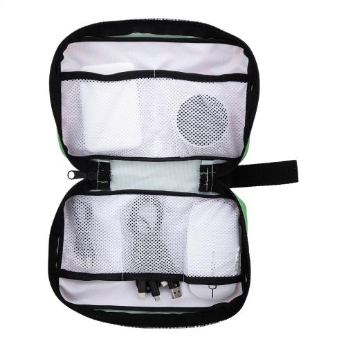 Custom made, zipped RPET cable organizer case with mesh inside compartments. With all over sublimation printed graphics. 600D RPET polyester with distinctive RPET label. MOQ: 25 pcs.
