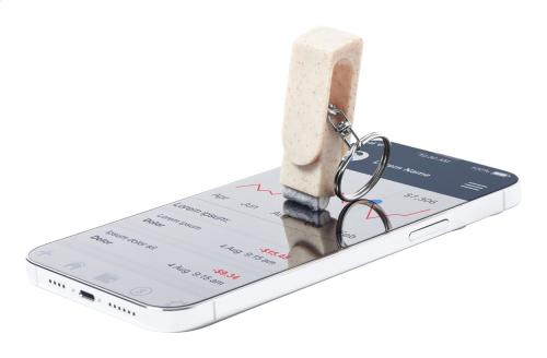 Ecological wheat straw plastic mobile holder with screen cleaner and metal keyring.