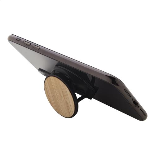 Bamboo covered, round shaped, plastic mobile holder with self-adhesive base.