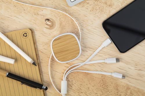 Telescopic USB charger cable in recycled ABS and bamboo. With micro USB, USB-C and Lightning connectors. With USB and USB-C inputs.