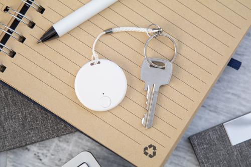 Wireless anti-lost key finder device with camera shutter, in round shaped plastic housing. With string and metal keyring. With button cell battery. Operates with a free iOS / Android App.