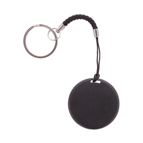 Wireless anti-lost key finder device with camera shutter, in round shaped plastic housing. With string and metal keyring. With button cell battery. Operates with a free iOS / Android App.