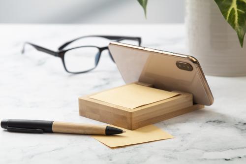 Bamboo mobile phone holder with 125 sheets recycled kraft paper notepad (75x75 mm).