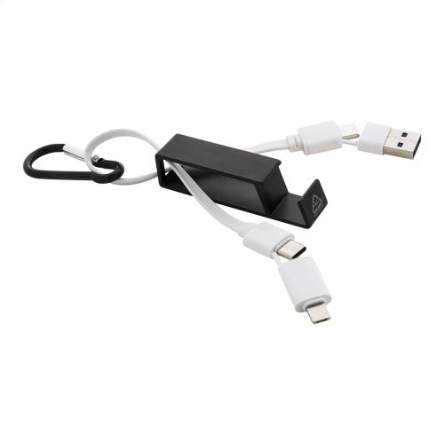USB charger cable with recycled aluminium carabiner and mobile holder with bottle opener function. With micro USB, USB-C and Lightning connectors. With USB and USB-C inputs.
