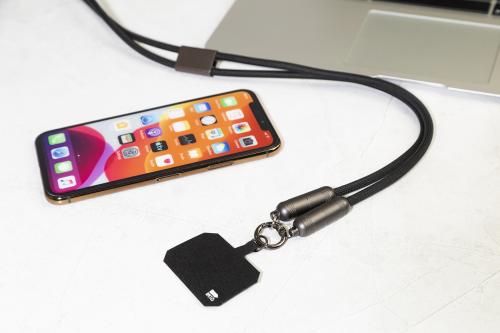 RPET mobile holder lanyard with phone insert and integrated USB-C to USB-C charger cable with hidden metal connectors. Supporting 60W PD fast charging and data transfer.