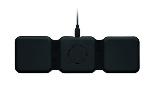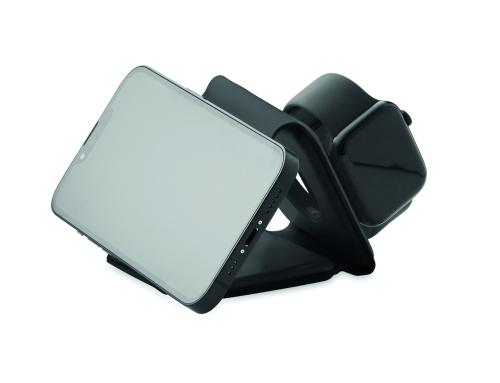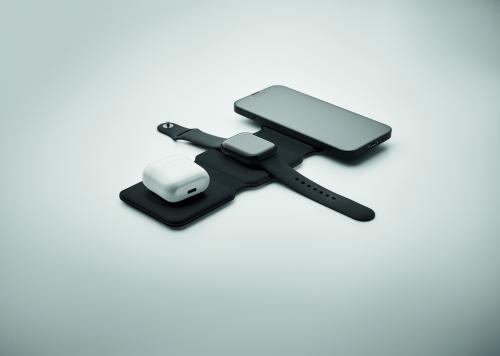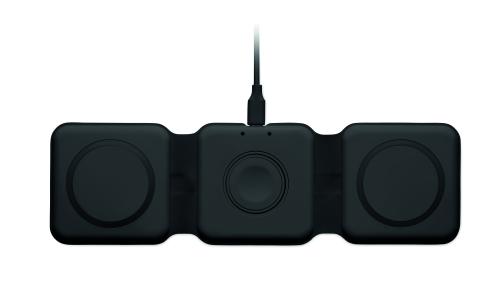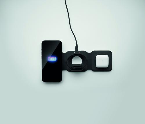3 in 1 foldable charging station in ABS. It has 3 wireless charging spots (15W). Input: 2-in-1 Type-C and Type-A.
