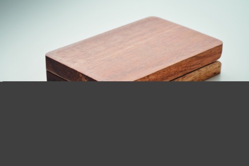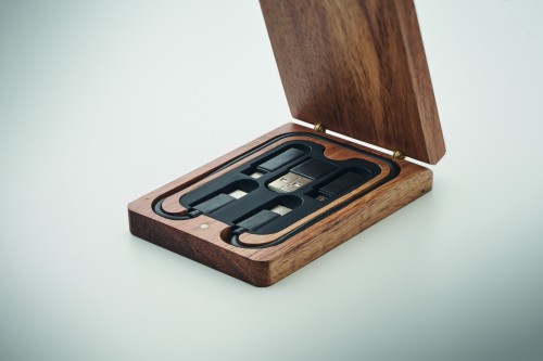 3-in-1 charging and data transfer cable with different connectors. Presented in acacia wood box. Type-C to Type C cable, C to USB-A, C to micro-B, C to lightning connectors.