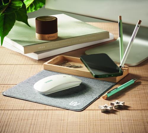 Wireless charger and desk organizer in bamboo with phone stand, 3 pen holders and foldable RPET mouse mat. Output: DC 9V/1.67A (15W).