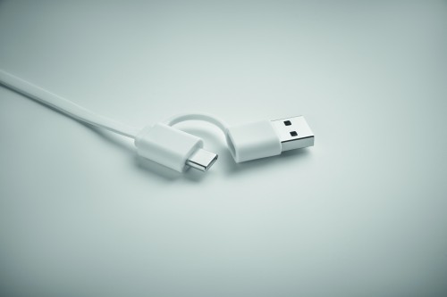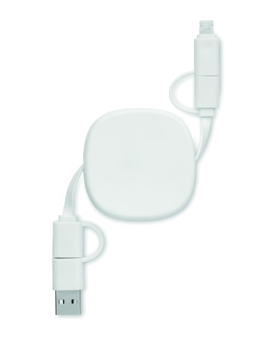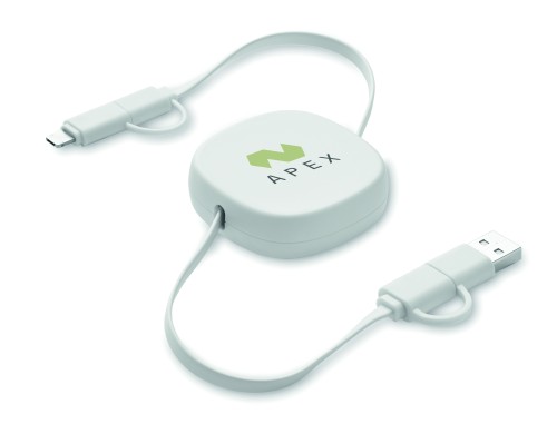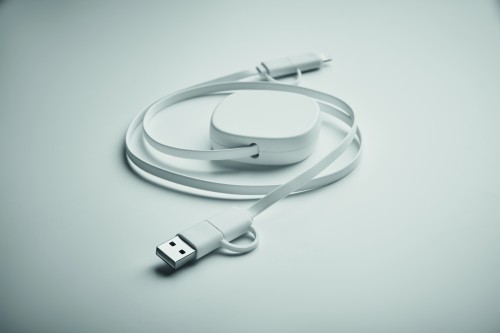 60W retractable cable in recycled ABS casing. Input: 2-in-1 Type-C and Type-A. Output: Type-C and micro-B (2 in 1 pin). Cable length: 80 cm.