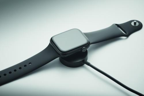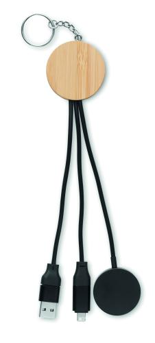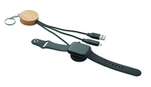 Key ring 4 in 1 data transfer and charging cable 60W with bamboo detail. Input: 2-in-1 Type-C <(>&<)> Type-A. Output: Watch charging (Samsung® and Apple®) , type-C and micro-B (2 in 1 pin).