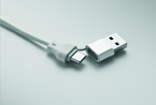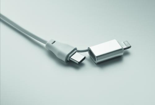 Key ring 4 in 1 data transfer and charging cable 60W with bamboo detail. Input: 2-in-1 Type-C <(>&<)> Type-A. Output: Watch charging (Samsung® and Apple®) , type-C and micro-B (2 in 1 pin).