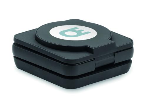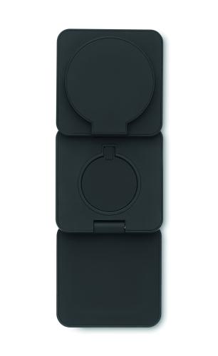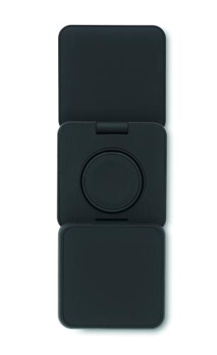 3 in 1 foldable charging station in rubberized recycled ABS. It includes a magnetic wireless charger 15W, smartwatch charger (Apple®only) and TWS charger.