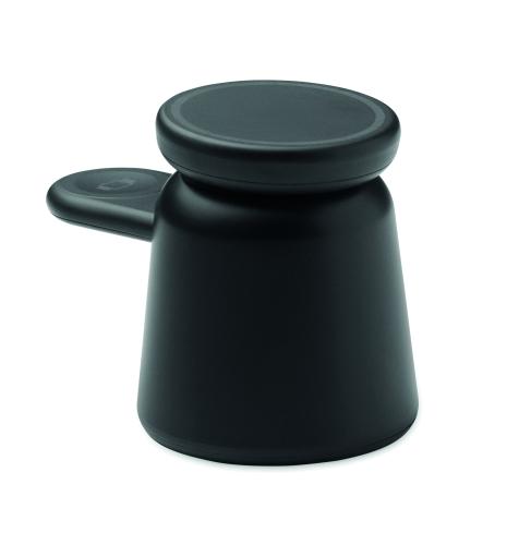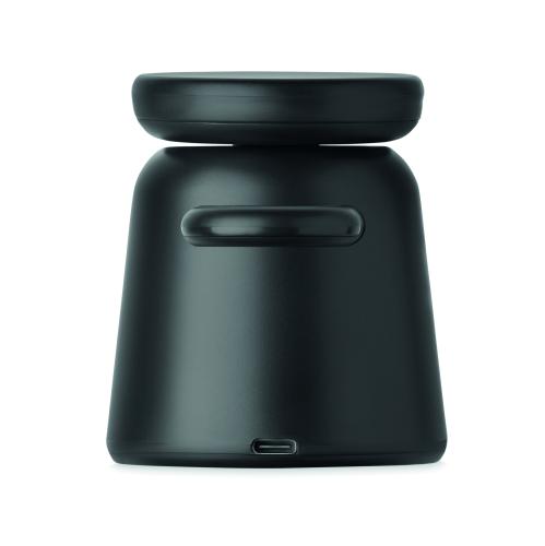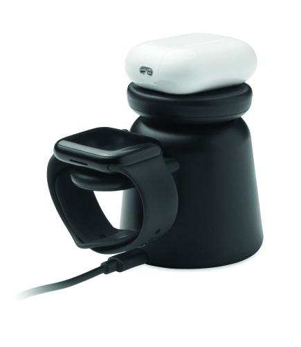3 in 1 charging station in ABS. Includes 15W magnetic wireless charger for phone and TWS with phone holder functionality and smartwatch charger (iOS only). Magnetic feature compatible with iPhone® 12 and newer. Including additional magnetic metal ring to support charging of other non-magnetic wireless chargeable phones.