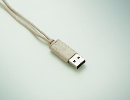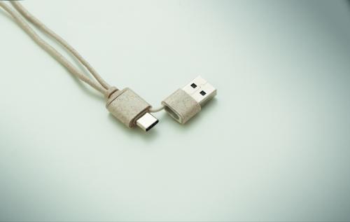 Cable set in wheat straw/ABS case with bamboo top and carabiner. Lid serves as phone stand (in horizontal position). Cable input 2in1 USB-C/A, output Type-C and 2 in 1 pin.