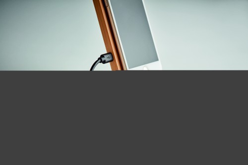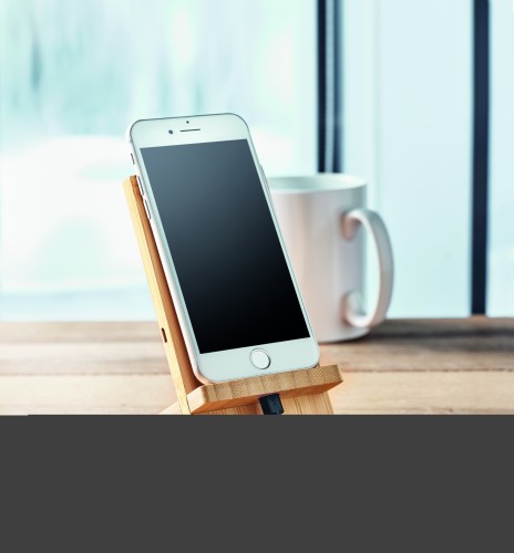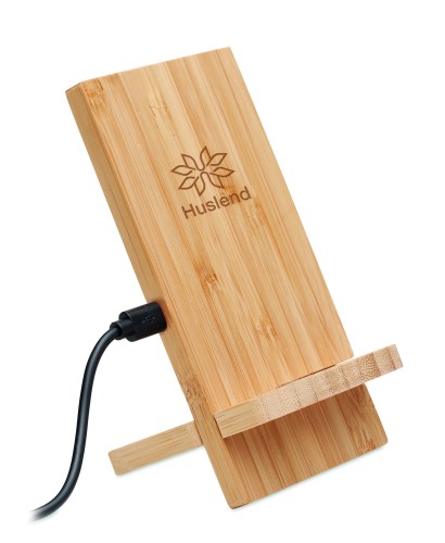 Double coil wireless charger stand in bamboo. Place smartphone on it to begin charging. It includes 2 parts, assembly required. Output: DC 9V/1.1A (10W) for quick charging. Bamboo is a natural product, there may be slight variations in colour and size per FSC 100% | N5.7 | FSC-C213206