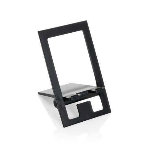Flat and foldable phone stand made from RCS recycled ABS. The stand comes flat and folded and can be unfolded into a phone stand that can carry all size phones. The stand is strong enough to adjust the viewing angle. With silicon cushioning to keep your phone in optimal condition. Total recycled content: 85% based on total item weight. RCS certification ensures a completely certified supply chain of the recycled materials. Packed in FSC® packaging. PVC Free.