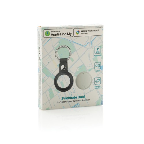 Find anything, no matter what phone you use! Findmate Dual is a premium recycled ABS item finder that works seamlessly with both Apple’s Find My network and Android’s Find Hub network. With end-to-end encryption provided by Apple and Google, your location data is secure, so you can keep track of your favourite items in real time—wherever you are in the world. Attach it to your wallet, keys, bag, luggage, or even your pet, and locate it instantly using the Apple Find My App or any Android Find Hub compatible device. Equipped with an extra-loud 100 dB alarm and an integrated speaker for beeping signals, Findmate Dual makes close-range recovery effortless.Its IPX5 waterproof rating guards against splashes and rain, while the luxury PU keychain holder ensures both durability and style. Activate Lost Mode to receive notifications when you leave your belongings behind, and enjoy up to one year of battery life (replaceable CR2032). Made out of RCS certified recycled ABS plastic.FSC packaging.