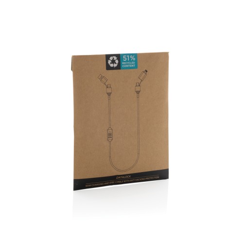 60W charging and data cable that can charge all your mobile devices at top speed and even supports laptop charging. The cable has a unique integrated button to switch off the data transfer function when using the cable in public to avoid data theft or hackers accessing your phone. Simply push the button to activate the protection mode. The cable is made with recycled TPE, PET, ABS and recycled aluminium. 120 CM long and supports Car play and Android auto (type C to type C only) . Total recycled content: 52% based on total item weight. RCS certification ensures a completely certified supply chain of the recycled materials. Packed in FSC mix packaging. PVC free.