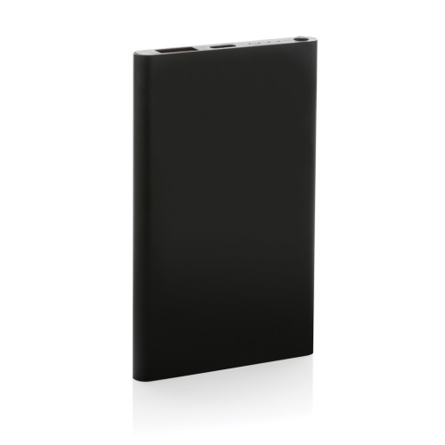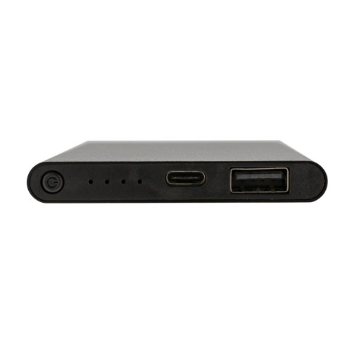 4.000 mAh flat design powerbank with the case made out of RCS certified recycled Aluminum/ABS plastic. RCS (Recycled Claim Standard) is a standard to verify the recycled content of a product throughout the whole supply chain. Total recycled content: 36 % based on total item weight. The powerbank supports both charging via USB A as well as type C. The powerbank contains a long lasting grade A 4.000 mAh lithium polymer battery. The power indicators will indicate the remaining energy level so you always know when to re-charge.; Type-C Input 5V/2A; Type C output:5V/2A USB A output: 5V/2A. Item and accessories PVC free. Including RCS certified recycled TPE charging cable. Packed in FSC® mix packaging.