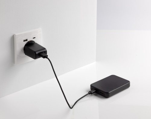 5.000 mAh pocket size powerbank with USB C input/output port and additional USB A port. The case is made from RCS certified recycled ABS plastic. RCS (Recycled Claim Standard) is a standard to verify the recycled content of a product throughout the whole supply chain. Total recycled content: 25 % based on total item weight. When fully charged the powerbank provides you with enough energy to re-charge your mobile phone up to two times. The powerbank contains a long lasting grade A 5.000 mAh lithium polymer battery. The power indicators will indicate the remaining energy level so you always know when to re-charge. Type-C Input 5V/2.4A; USB A: output 5V/2.4A, Type C output:5V/2A Item and accessories PVC free. Including RCS certified recycled TPE charging cable. Packed in FSC® mix packaging.