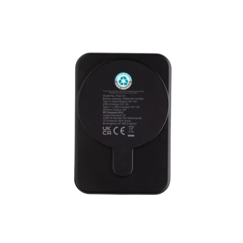 5.000 mAh pocket size powerbank with 5W magnetic wireless charger where the case is made out of RCS certified recycled ABS plastic. RCS (Recycled Claim Standard) is a standard to verify the recycled content of a product throughout the whole supply chain. Total recycled content: 20 % based on total item weight. With USB A and UCB C output option. The powerbank contains a long lasting grade A 5.000 mAh lithium polymer battery. The power indicators will indicate the remaining energy level so you always know when to re-charge.; Type-C Input 5V/2.4A; USB C /USB A output:5V/2A.4A Item and accessories PVC free. Including RCS certified recycled TPE charging cable. Packed in FSC® mix packaging.