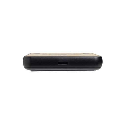 5.000 mAh pocket size powerbank with 5W magnetic wireless charger with a case made out of RCS certified recycled ABS plastic and FSC certified bamboo.. RCS (Recycled Claim Standard) is a standard to verify the recycled content of a product throughout the whole supply chain. Total recycled content: 22 % based on total item weight.The powerbank contains a long lasting grade A 5.000 mAh lithium polymer battery. With integrated phone stand. The power indicators will indicate the remaining energy level so you always know when to re-charge.; Type-C Input 5V/2.4A; Type C output:5V/2A.4A Item and accessories PVC free. Including RCS certified recycled TPE charging cable. Packed in FSC® mix packaging.